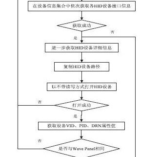 HID 设备连接到主机后,以厂商ID(VID)。产品ID(PID)和产品版本号(PVN)三项属性值的组合作为设备唯一标识.Wave Panel 的三项属性值可以从产品说明书直接获取。由于一台主机可能同时连接有多台HID 设备,所以在通讯前应用程序必须要识别并打开Wave Panel,这一过程需要调用多个Windows API函数实现。基本方法是首先获取当前与主机连接的所有HID 设备信息的集合,然后逐一枚举集合中的各设备,并比较VID.PID 和PVN 值。当三项属性值都与Wave Panel 相等时表示已经找到,调用CreateFile()将该Wave Panel 打开,并保存Wave Panel 设备句柄。该模块的流程如图1 所示。