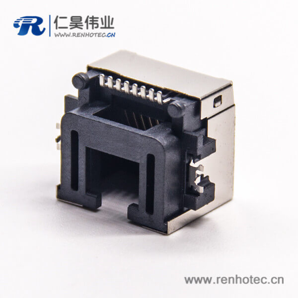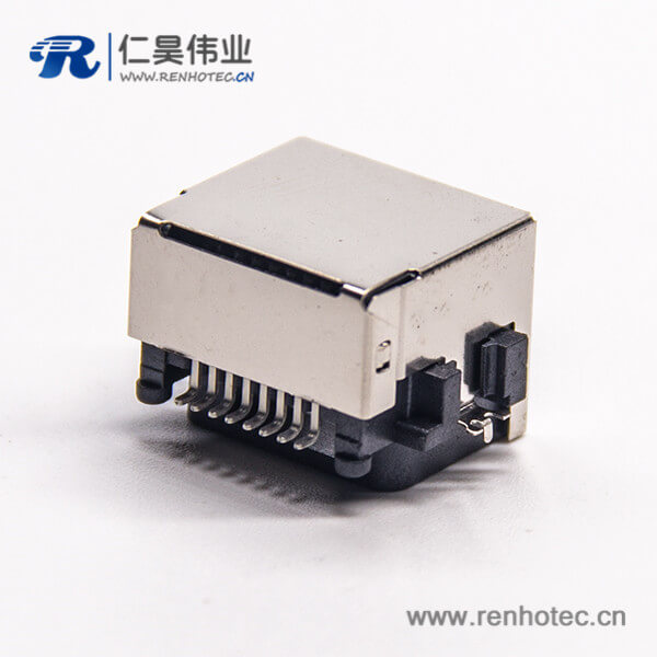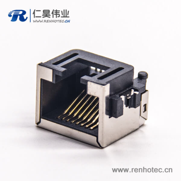 标签:RJ45插座,8P8C,单端口,1*1,弯式90°,触头镀金,沉板贴板,PCB板安装,带屏蔽,不带灯,不带滤波