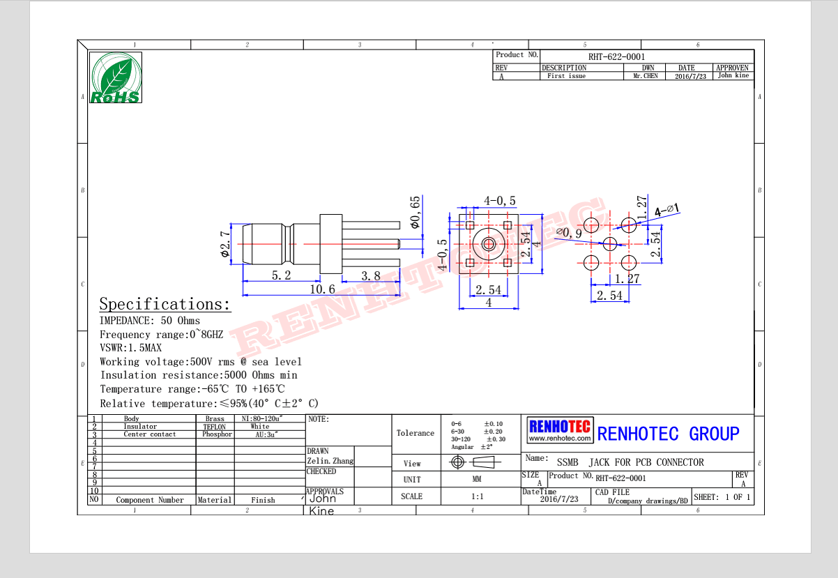 料号:RHT-622-0001 标签:PCB板端,母头,直式,插孔,RF射频同轴,SSMB阿联酋vs丹麦亚盘 产品特点: